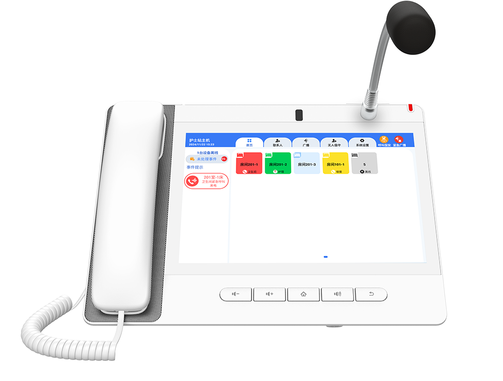 以IP和SIP协议为核心设计的一款专为医护行业设计的产品,适用于养老院、诊所、医院等场景。 为老人、医护工作者等提供医护呼叫和紧急呼叫功能。 它配备PTM手柄、鹅颈麦克风、内置角度可调节的摄像头(带隐私盖),可与床头分机、门禁进行双向音视频对讲。 软件集成广播功能,可对IP音箱,床旁分机等设备进行广播喊话,支持紧急喊话和分组喊话广播功能。